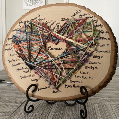 I had a bag full of embroidery floss of all colors, so each friend picked their own unique color and tied it to their peg. Then they stretched the string from their peg to the center heart and back again, to symbolize their connection with me. But that wasn’t where it ended! Then they stretched the string around the board to the names of other people they are connected to — friends from church, work, school, or the neighborhood. Some people had one or two connections, and some wove their string all over the heart. There were even some surprises, as people realized their second cousin or a long-lost high school friend was part of the team!